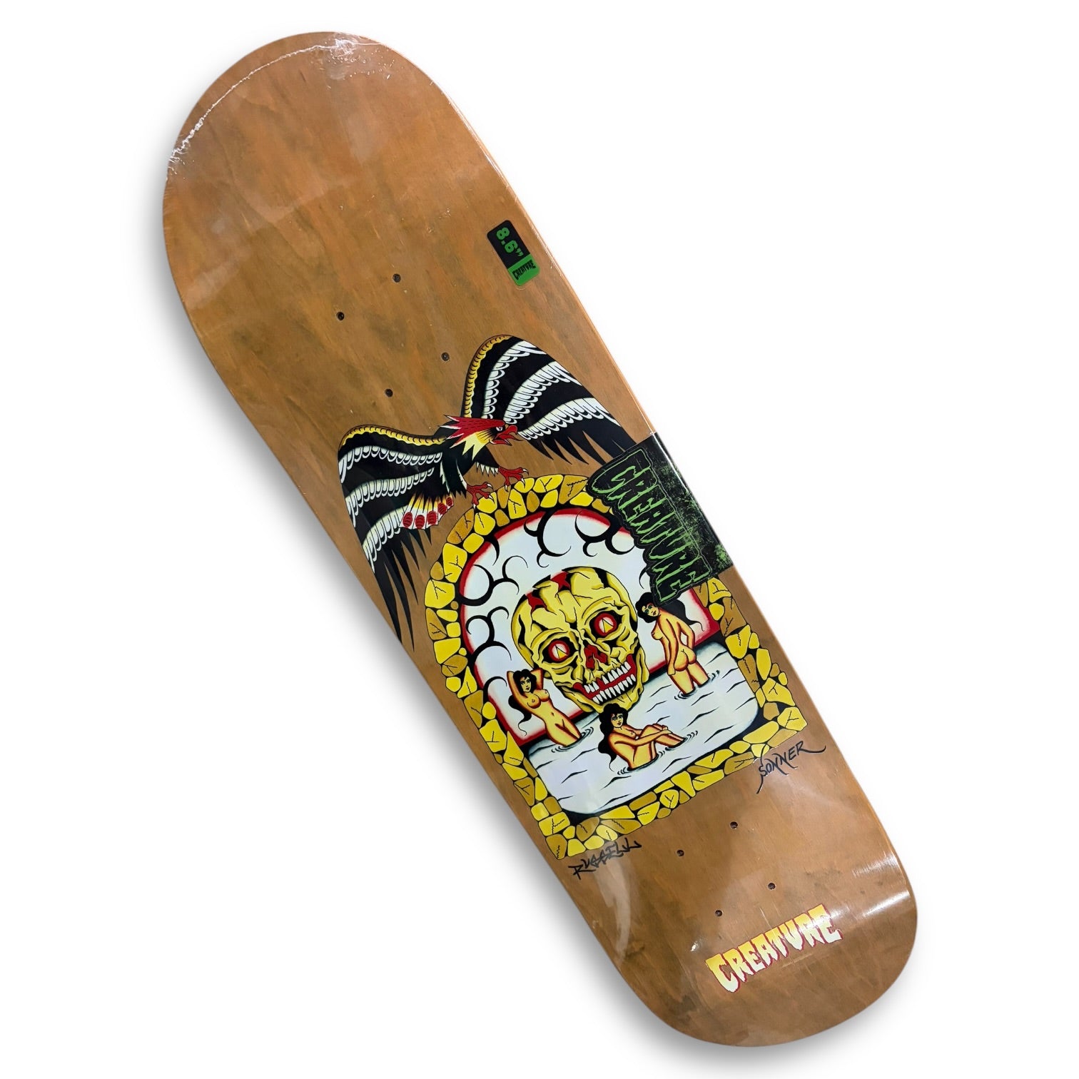 The Flash Art doubles as a tribute to the late great tattoo artist and friend of the fiends, Scott Sonner. Sonner's flash art lives on with Russell's 8.6" pro skateboard deck.
