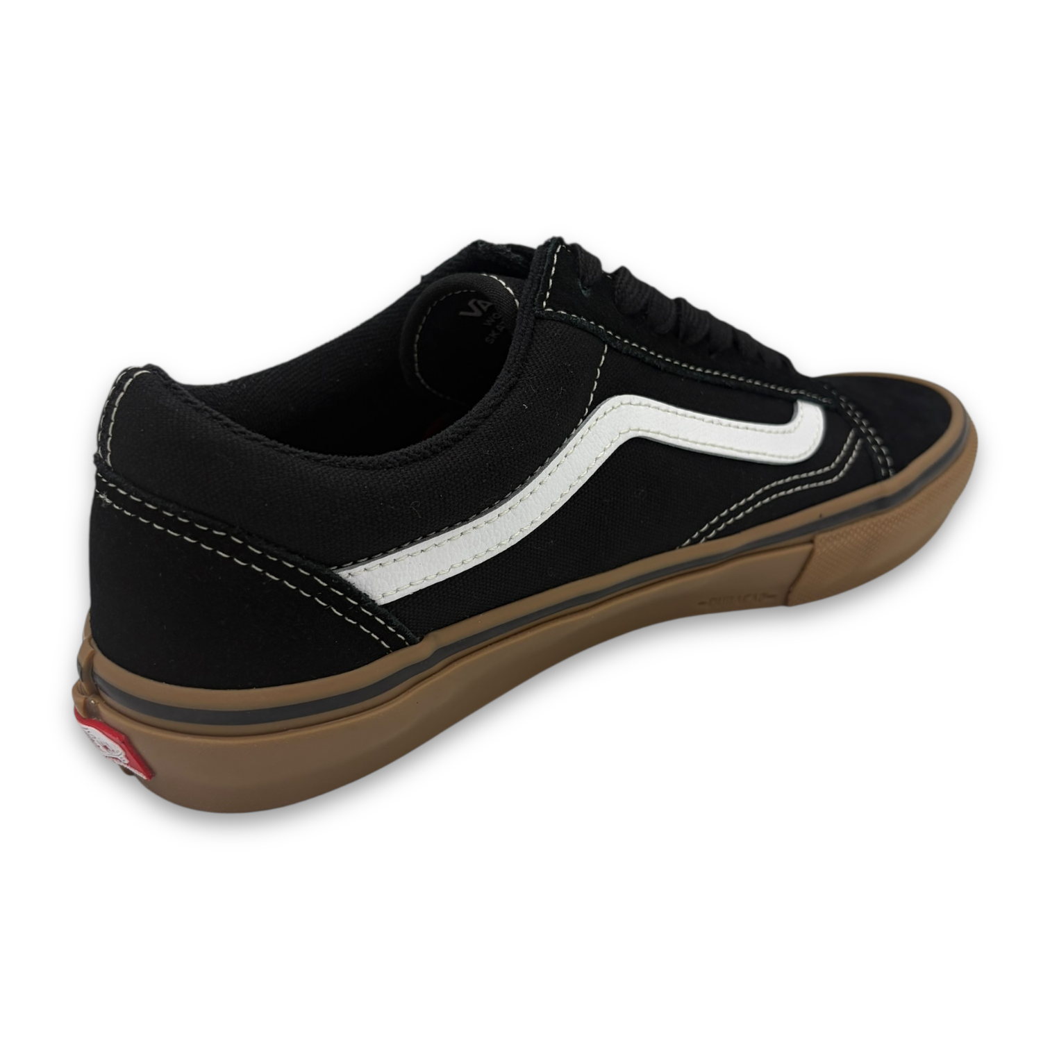 Black upper canvas with white vans stripe Gum colored bottom, white laces and a mini-checkered sidetag.