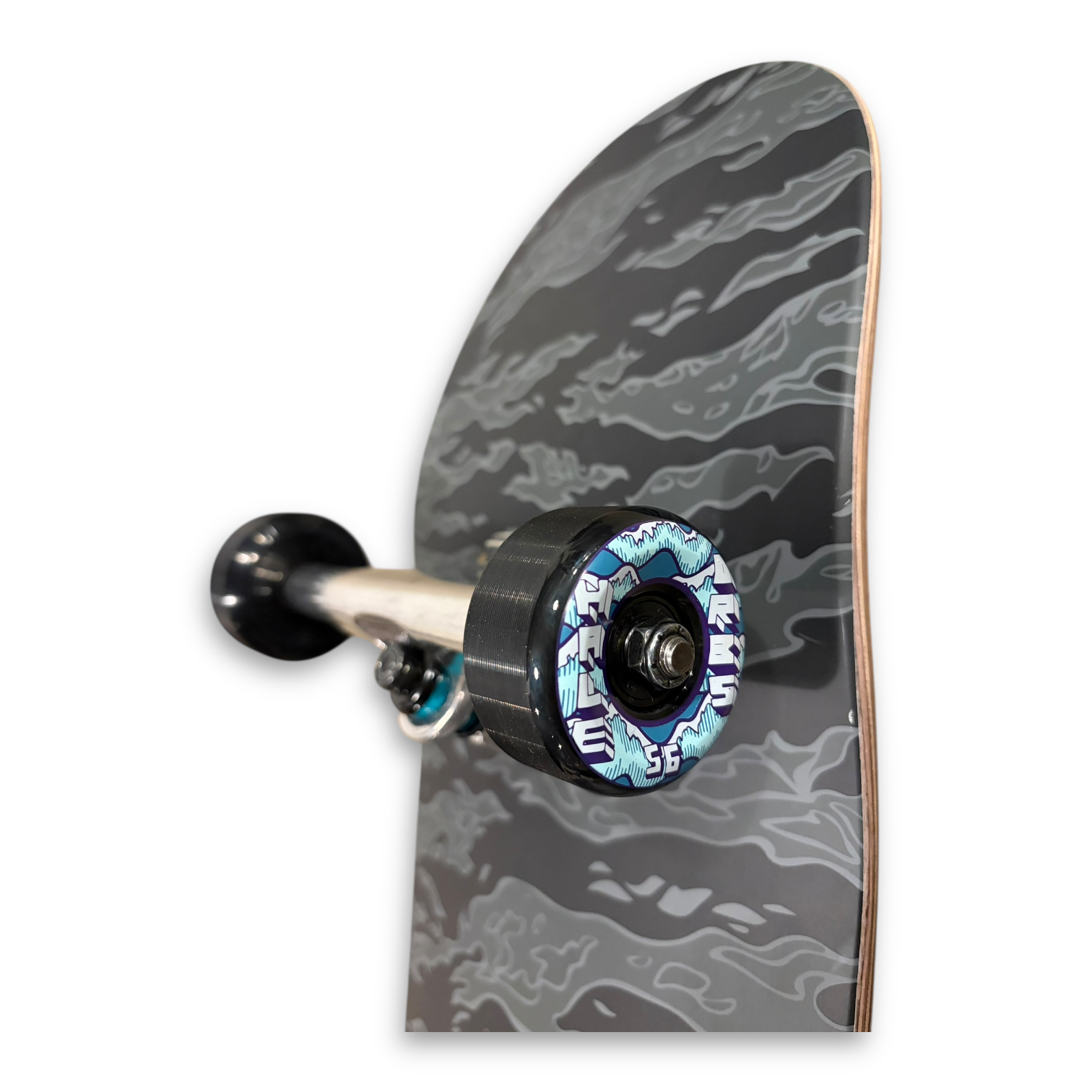 It has a Matte Black & White Winter Camo styled graphic that we complimented the board with ORB Wheels in Black with a similar graphic.