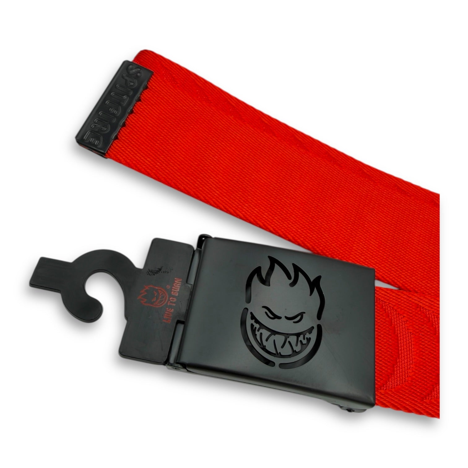 Die-Cut Belt Buckle with Spitfire Bighead Logo included with a Red jacquard web belt with a half moon design.